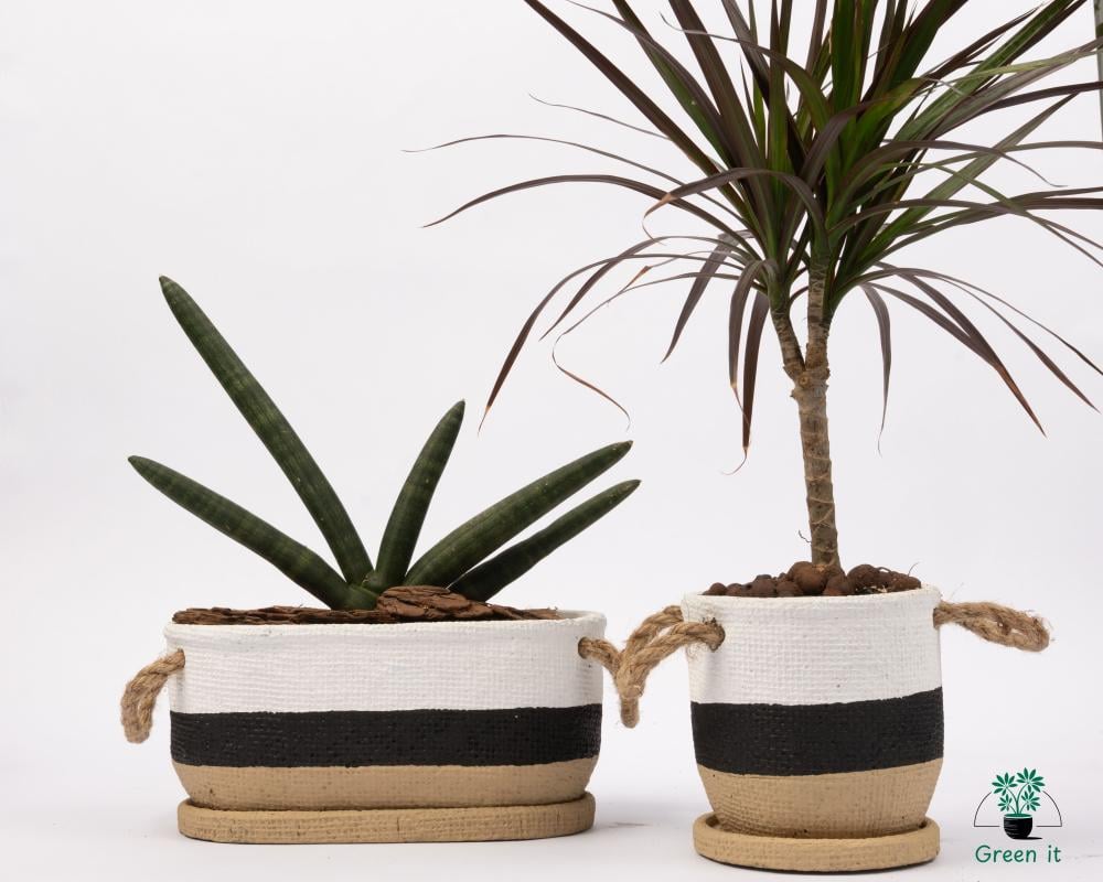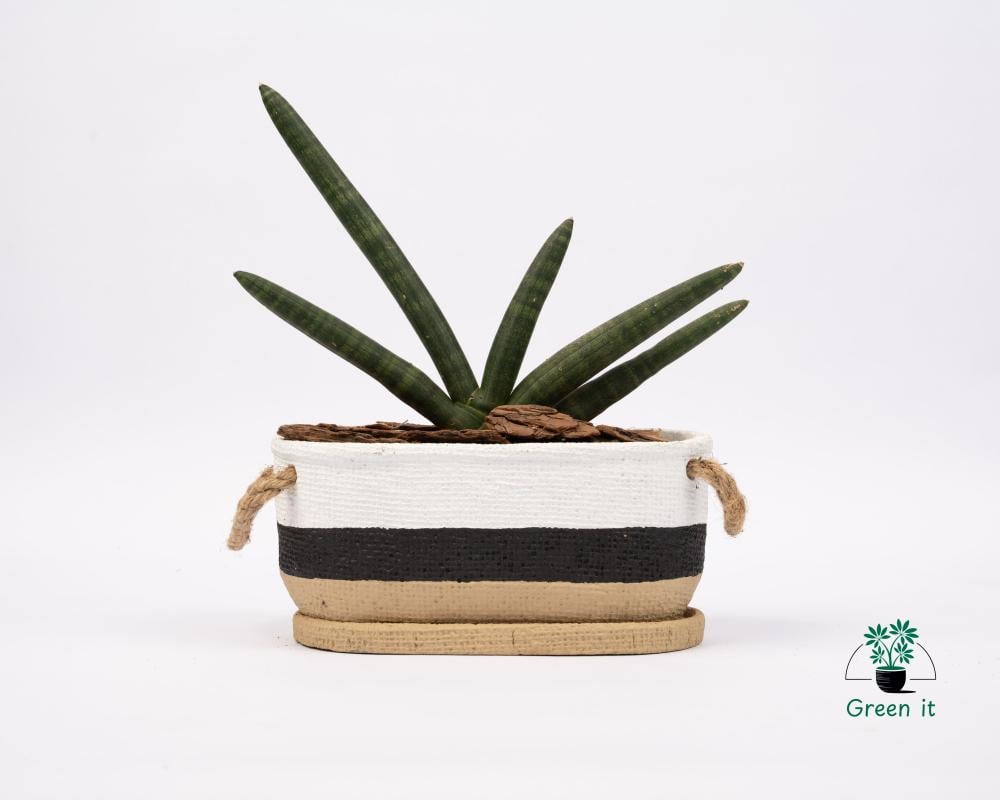 - وعاء أسمنتي أنيق: تصميم مستطيل بفوهة بيضاوية يكمّل جمال النبات ويضيف طابعًا ديكوريًا فريدًا.