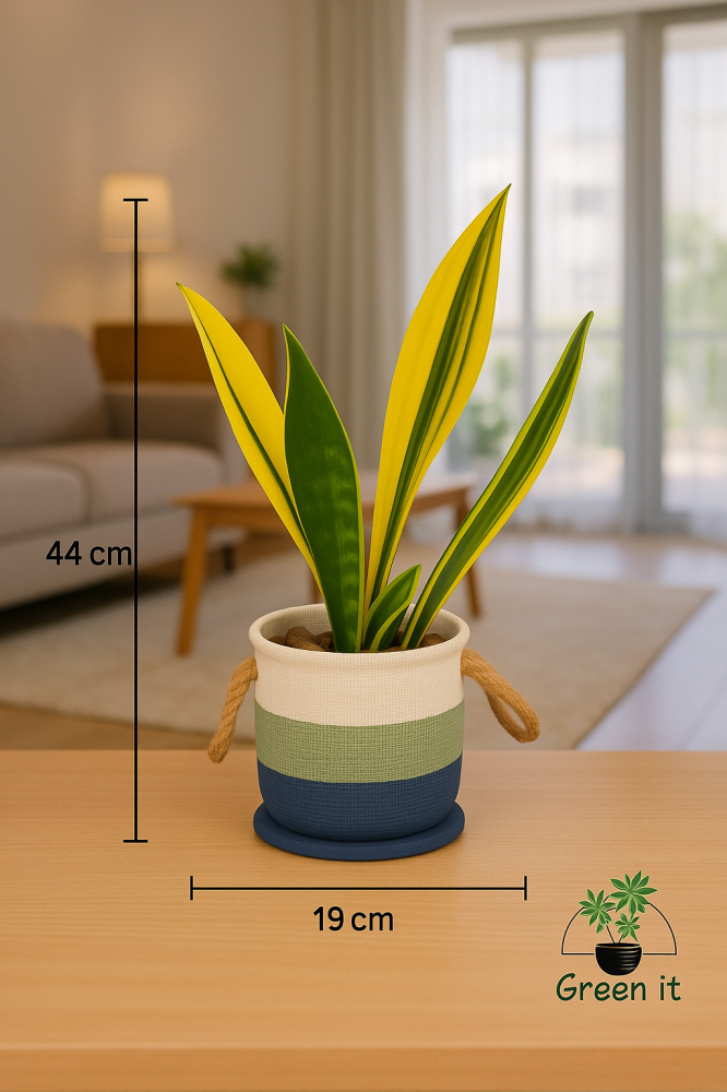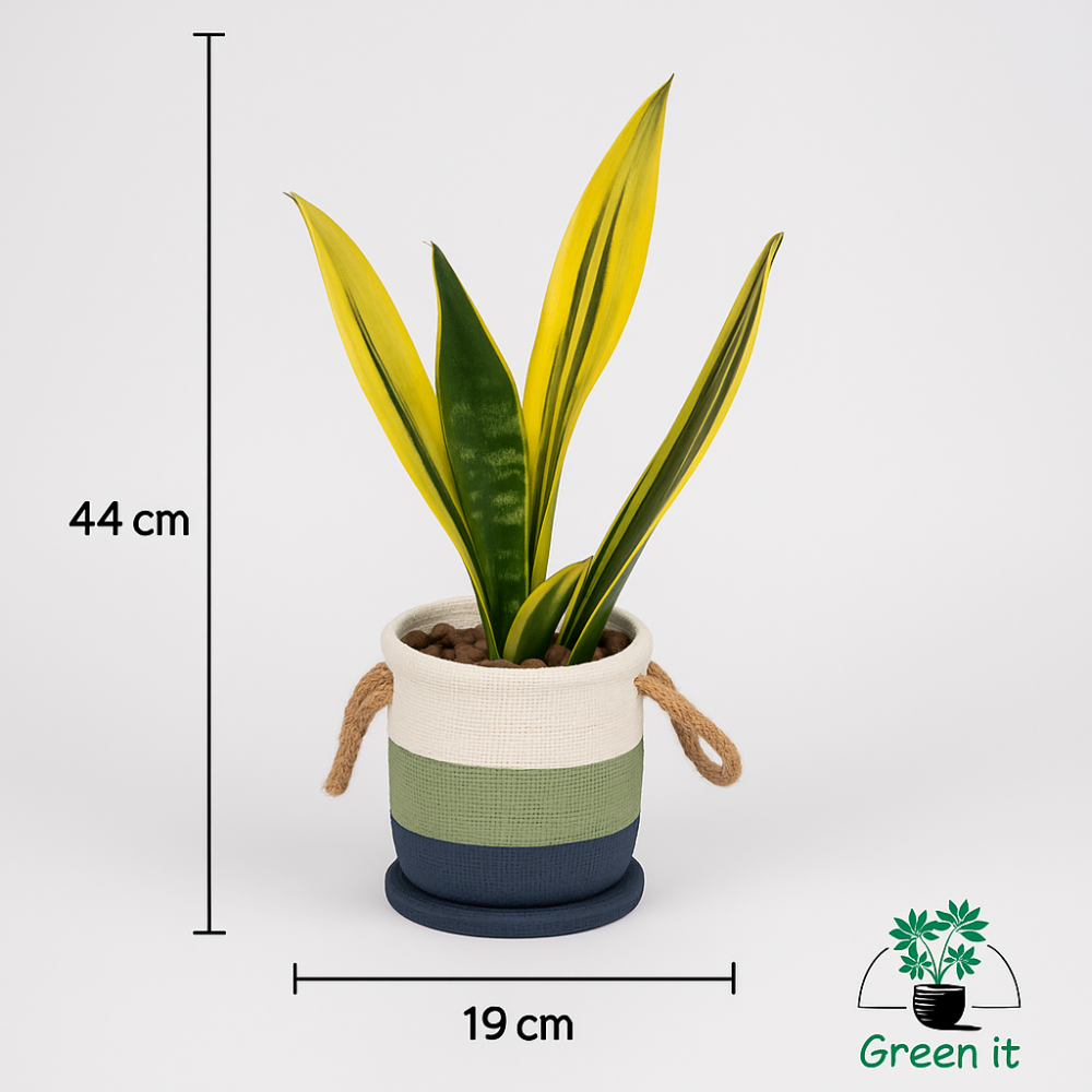 نبتة قوية بأوراق سيفية طويلة ومقلمة بلون أخضر داكن مع حواف صفراء لامعة، تضيف لمسة فاخرة لأي مكان.